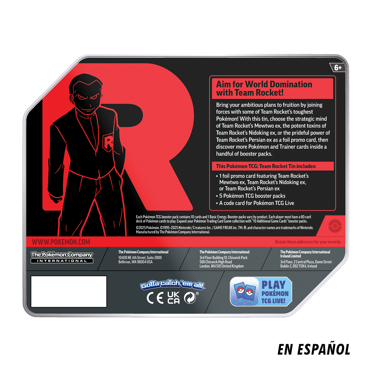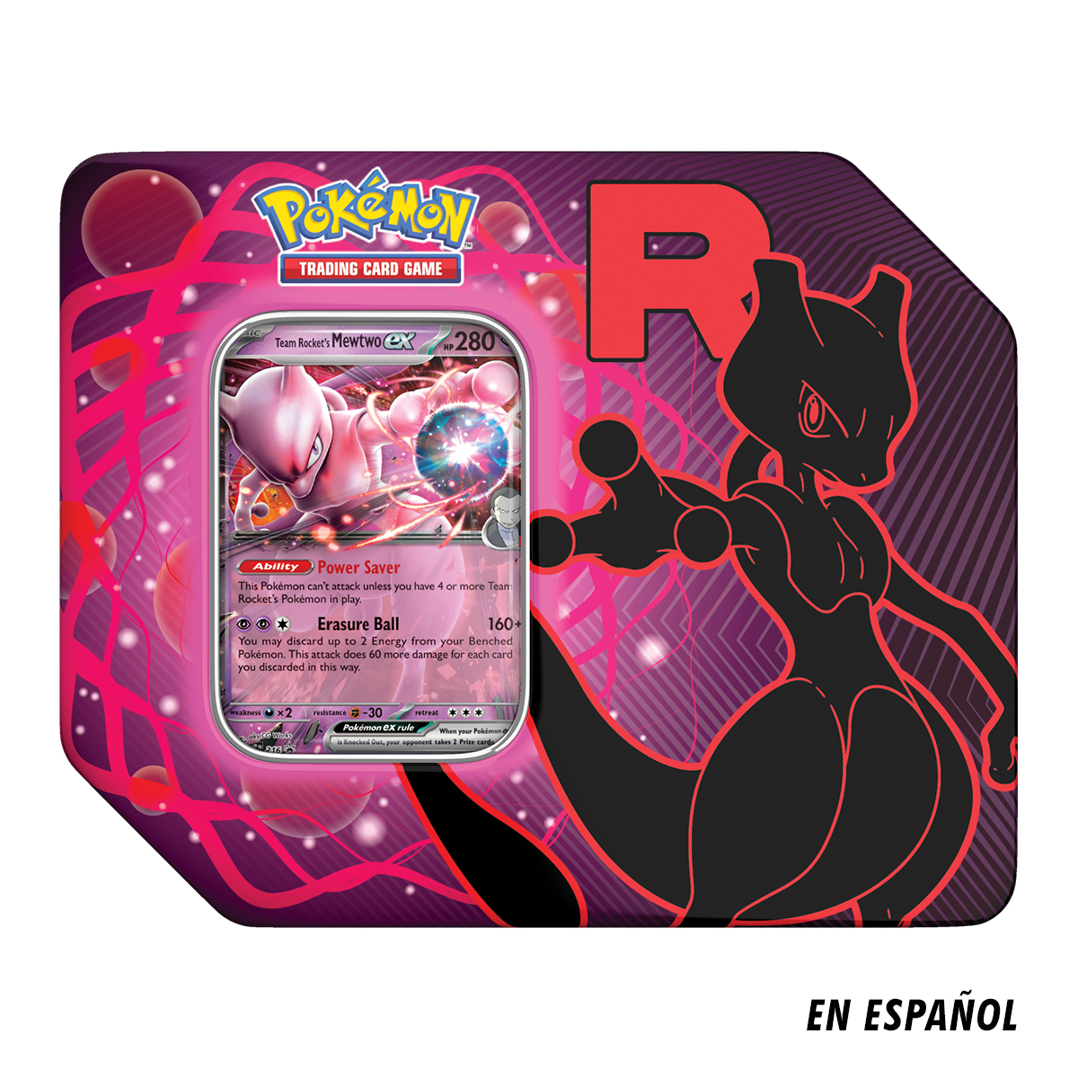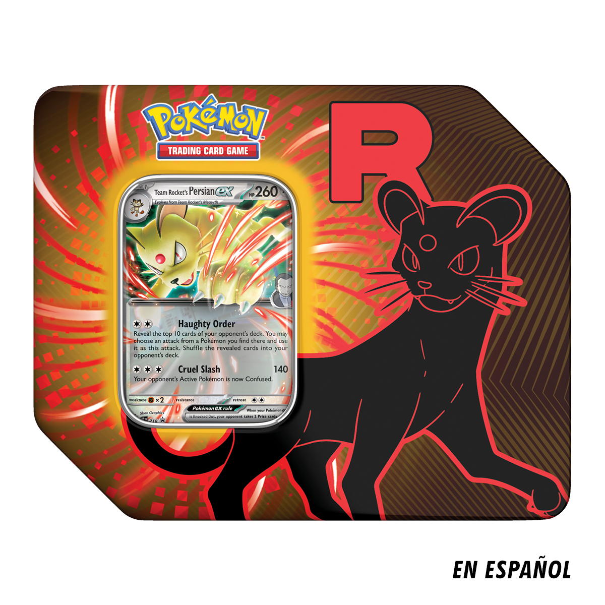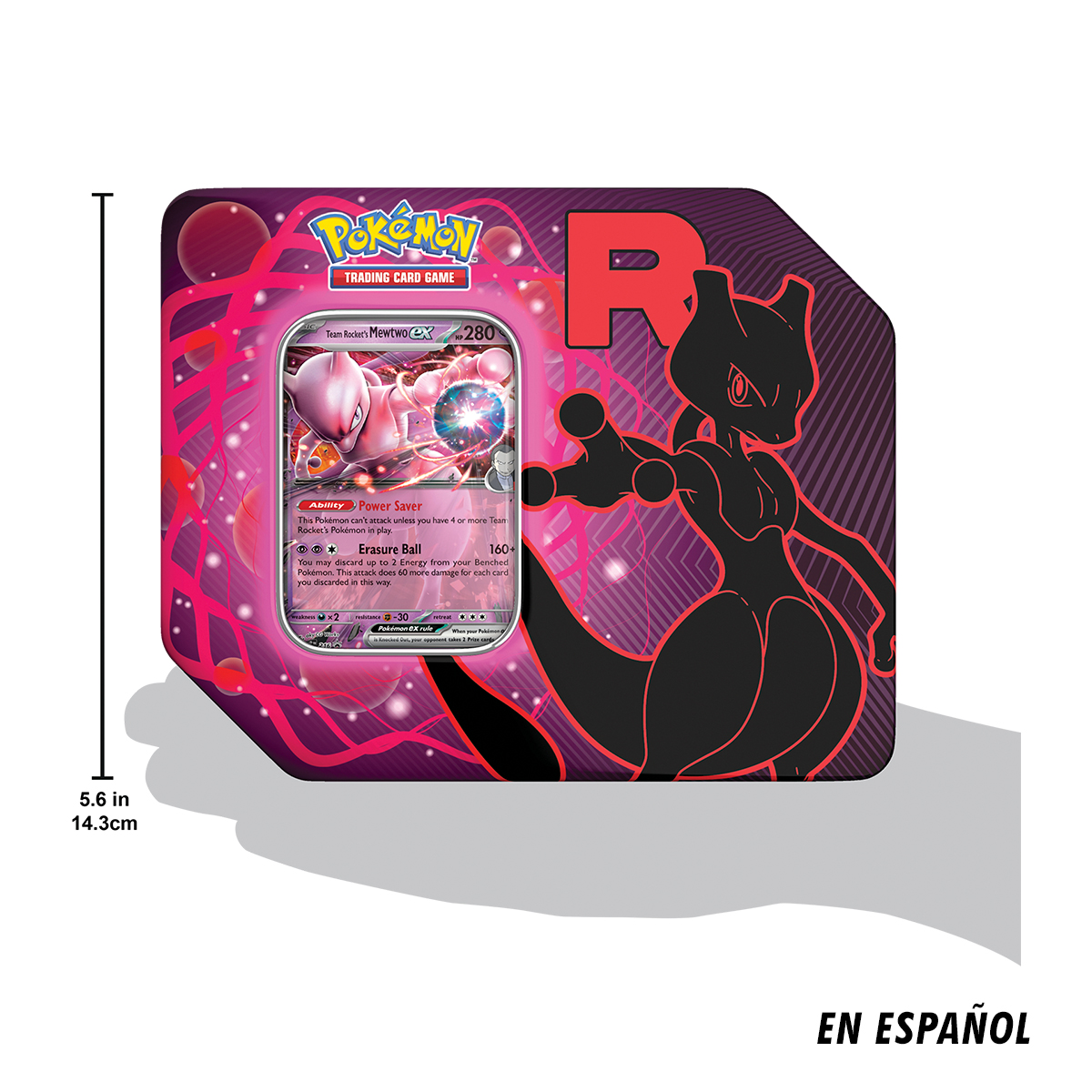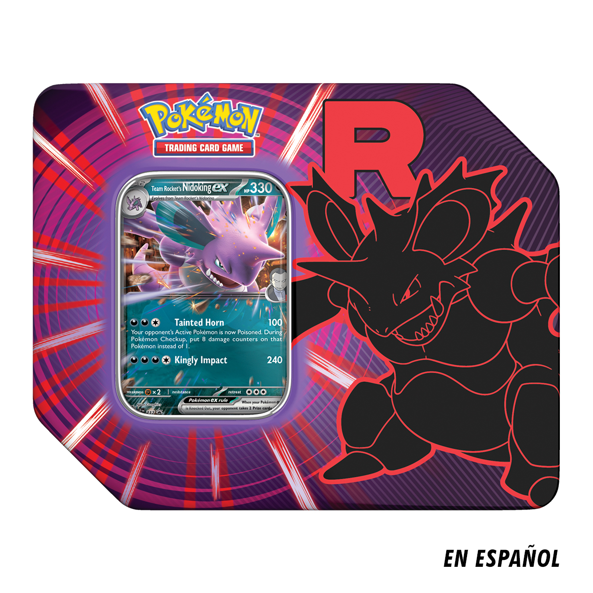 ¡Ejecuta tus ambiciosos planes con la ayuda de algunos de los Pokémon más formidables del Equipo Rocket! Con esta lata, podrás elegir entre la estratégica mente de Mewtwo ex del Equipo Rocket, las potentes toxinas de Nidoking ex del Equipo Rocket o el soberbio poder de Persian ex del Equipo Rocket, que llegan en forma de cartas promo holográficas. También descubrirás más cartas de Pokémon y de Entrenador dentro del montón de sobres de refuerzo incluidos.