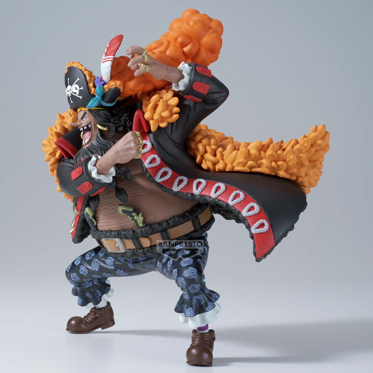 Marshall D. Teach, el temible Barbanegra, se alza imponente en esta figura de Banpresto. Con su capa ondeando al viento y una expresión de soberbia en su rostro, Teach exuda el poder y la oscuridad que lo caracterizan. Su mano izquierda sostiene la Yami Yami no Mi, su fruta del diablo, mientras que su derecha está lista para el combate. Los detalles de su tatuaje y los músculos de su cuerpo son fielmente recreados, resaltando la fuerza bruta de este pirata.