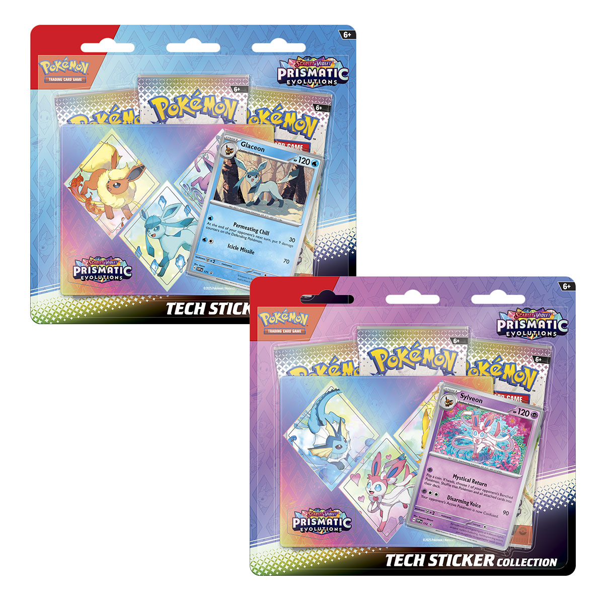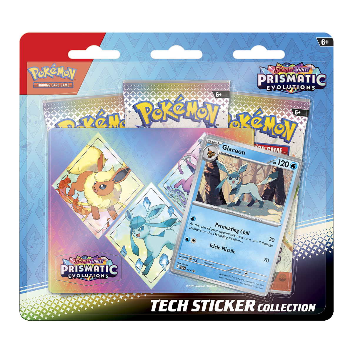 ¡Las tres evoluciones más recientes de Eevee, lindas pero majestuosas, no deben subestimarse en la batalla! ¡Une fuerzas con Leafeon, Glaceon o Sylveon como una carta promocional holográfica y luego decora tu computadora, tableta o teléfono con calcomanías tecnológicas duraderas! También obtienes tres paquetes de refuerzo de la expansión especial Scarlet & Violet—Prismatic Evolutions, esperando que los abras y los agregues a tu colección.