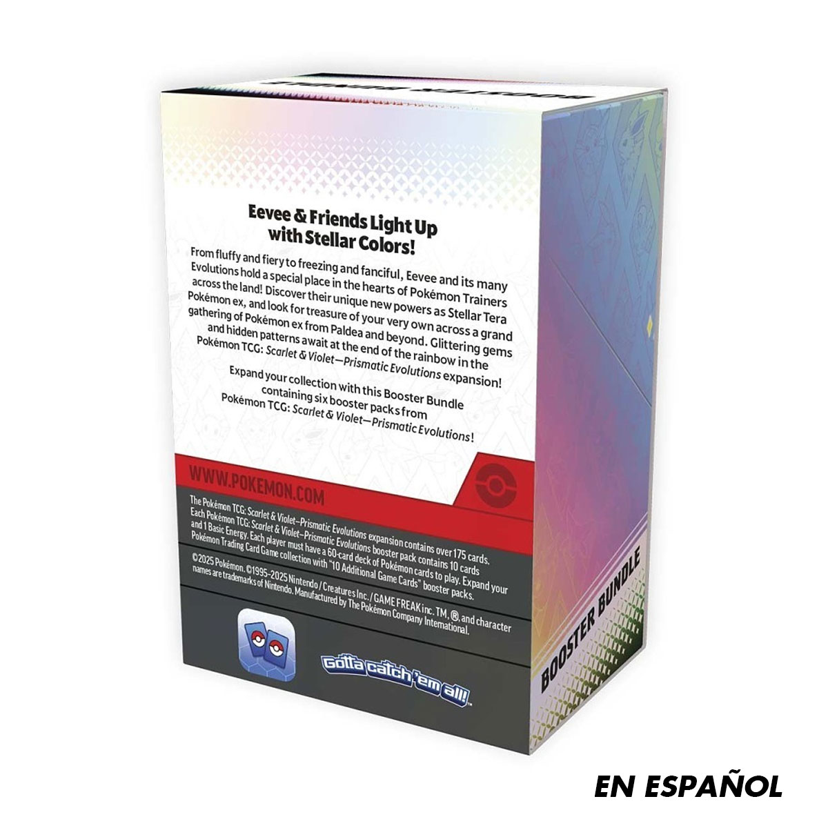 Desde esponjosos y ardientes hasta gélidos y extravagantes, Eevee y sus muchas evoluciones tienen un lugar especial en los corazones de los Entrenadores Pokémon de todo el mundo. Descubre sus nuevos poderes únicos como ex Pokémon Tera estelar y busca tu propio tesoro en una gran reunión de ex Pokémon de Paldea y más allá. ¡Joyas brillantes y patrones ocultos te esperan al final del arcoíris en la expansión Scarlet & Violet—Prismatic Evolutions de JCC Pokémon!