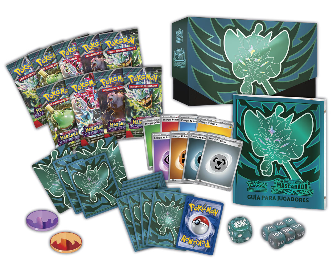 La Caja de Entrenador Élite de la Mascarada Crepuscular Escarlata y Violeta de JCC Pokémon incluye: